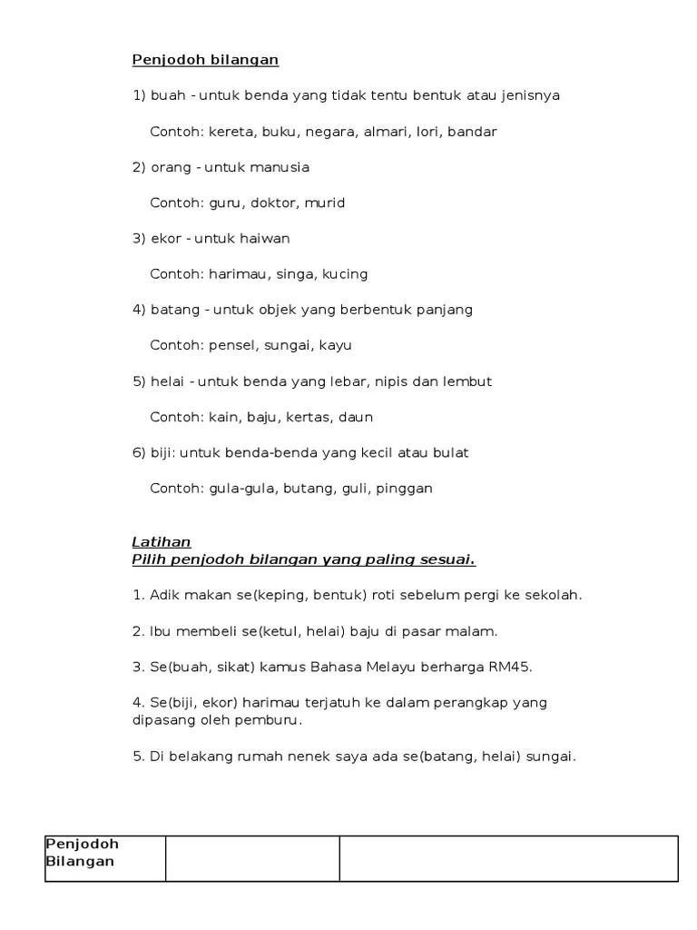 2 dua kuntum bunga mawar itu telah layu. Ibu membeli se(ketul, helai) baju di pasar malam. Daun telah gugur di halaman rumah. Penjodoh bilangan digunakan sebelum sesuatu kata atau nama. Benda nipis, lembut, serta lebar seperti kertas, baju, seluar,. Aktiviti penjodoh bilangan untuk p2.